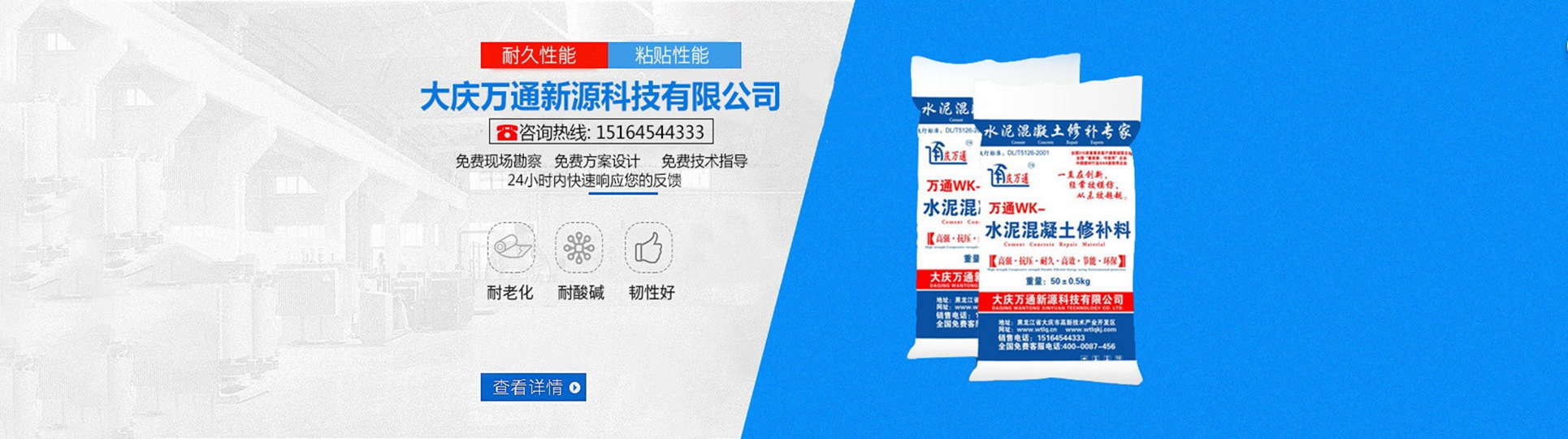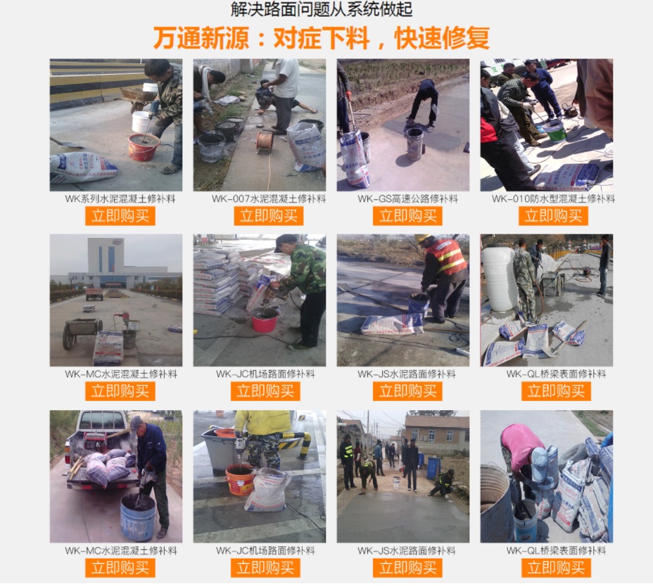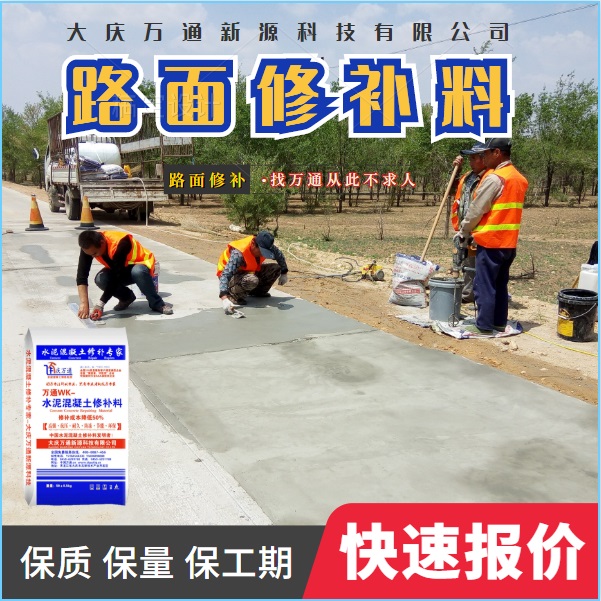 大慶萬(wàn)通新源科技有限公司獨(dú)有的混凝土路面高強(qiáng)速補(bǔ)料,是水泥混凝土路面病害修復(fù)的好材料。疲勞、凍融循環(huán)、彎曲壓力、滲水和基層破壞等原因都會(huì)引起水泥路面的破損,從而帶來(lái)高昂的維護(hù)費(fèi)用。與以往的剛性修補(bǔ)方法不同,混凝土水泥路面維修速補(bǔ)膠提供了一種獨(dú)特的柔性修補(bǔ)產(chǎn)品和技術(shù),高柔性、高抗拉性,可跨伸縮縫施工和高抗壓性使得混凝土快補(bǔ)產(chǎn)品為水泥混凝土路面提供了******性的修補(bǔ)。傳統(tǒng)的剛性修補(bǔ)方案,如環(huán)氧砂漿和快干水泥產(chǎn)品,由于其自身的粘結(jié)失效,抗疲勞性低以及與原路面不同的伸縮系數(shù),修補(bǔ)面會(huì)在短時(shí)間內(nèi)失效或產(chǎn)生新的裂縫,需要反復(fù)修補(bǔ),有效期短且費(fèi)用高昂。大慶萬(wàn)通新源科技有限公司的混凝土水泥路面維修速補(bǔ)膠可以隨原路面一起伸縮,移動(dòng),從而避免了粘結(jié)失效和產(chǎn)生新裂縫。萬(wàn)通快補(bǔ)產(chǎn)品優(yōu)異的粘結(jié)性、柔韌性和高防滑性,特別適用于水泥路面的淺層粘合修補(bǔ),多邊角混凝土板層修補(bǔ),跨伸縮縫修補(bǔ)以及路面沉陷修補(bǔ)。萬(wàn)通混凝土病害修補(bǔ)料針對(duì)混凝土起皮起沙、斷板裂縫、蜂窩麻面、坑槽露石子、漏筋掉皮、橋梁的掉皮漏筋快速通車使用時(shí)間長(zhǎng)。應(yīng)用萬(wàn)通快補(bǔ)產(chǎn)品,施工后一天就可以恢復(fù)交通。大慶萬(wàn)通新源科技有限公司的萬(wàn)通水泥路面維修速補(bǔ)膠適用于高速公路、機(jī)場(chǎng)路面、農(nóng)村村村通路面、廠坪、學(xué)校操場(chǎng)、市區(qū)公路、小區(qū)路面、橋梁、水泥路面的修補(bǔ)。使用萬(wàn)通特快補(bǔ)材料修補(bǔ)路面可以一勞永逸! 水泥地面起砂怎么辦,混凝土修補(bǔ)劑混凝土地面起砂,混凝土地面修補(bǔ),地面起砂怎么辦,